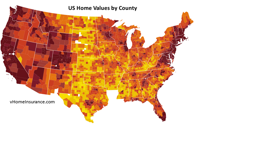 vHomeInsurance collected detailed data on home insurance & property values across the US and compared it within specific geographic and regional areas. Here is an example of home prices using a heat map showing the house prices across the US. Consumers & analysts need to understand where to live within those pockets based on home prices given the property values, home insurance & other factors.