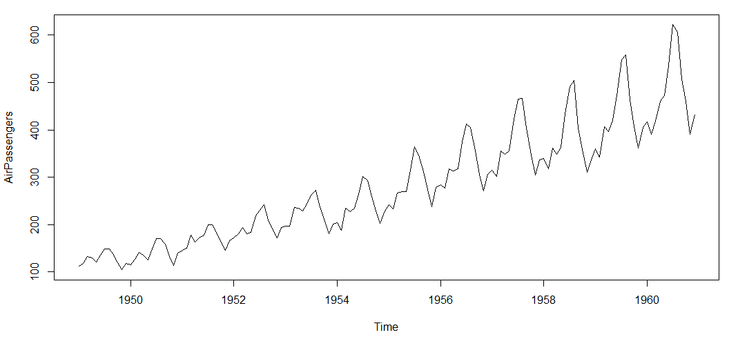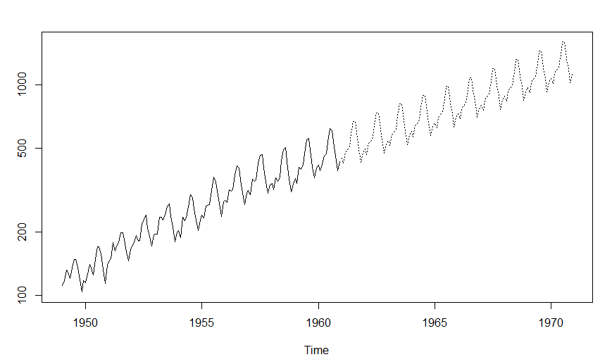 ts.plot(AirPassengers,2.718^pred$pred, log = "y", lty = c(1,3))[/stextbox]