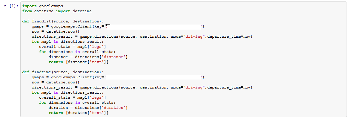 First of all, thanks a lot for sharing this wonderful article. It really helps students like me to think beyond text-books. I was trying to replicate this project and came up with some doubts (may be very silly). I will be obliged if you can answer it: a) While generating the Key from Google Maps - which one (Directions API/Distance Matrix API/any other) to select. Else if, the key is totally different than the three options above, can you please include a brief process to generate the Key. b) Will this code work for source and destination as latitude and longitude. If not, can something be done to calculate distance based on these. Thanks a lot in advance! It really helps :)