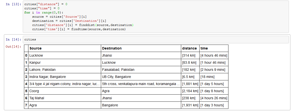 code2Notice that we have all types of combinations here. Combination 1 is a combo of two cities. Combo 4 is a combination of two detailed address. Combo 6 is a combination of a city and a monument. Let’s now try to get the distances and time & check if they make sense.