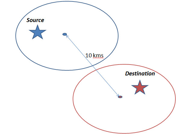 The two marked areas refers to different PIN CODES and the distance 10 kms is used as an approximate distance between the two points.