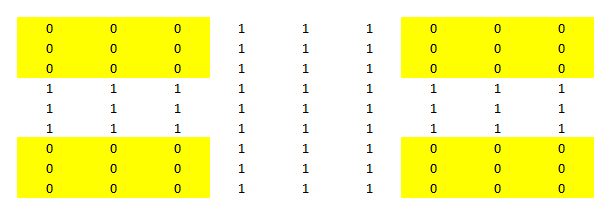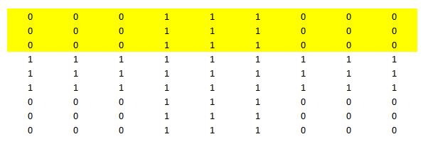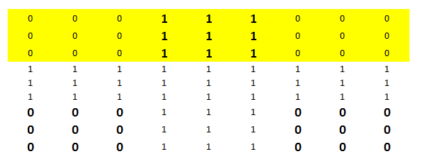 Step 2 : Make the first Decision stump : You have already read about decision trees in many of our previous articles. Decision stump is a unit depth tree which decides just 1 most significant cut on features. Here it chooses draw the boundary starting from the third row from top. Now the yellow portion is expected to be all 0’s and unshaded portion to be all 1’s. However, we see high number of false positive post we build this decision stump. We have nine 1’s being wrongly qualified as 0’s. And similarly eighteen 0’s qualified as 1’s.