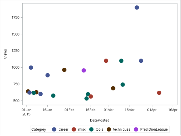 scatter X= dateposted Y = views/group=category