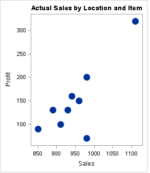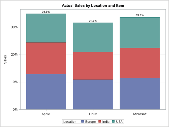 proc sgplot data=os; title 'Actual Sales by Location and Item'; vbar Item / response=Sales group=Location stat=percent datalabel; xaxis display=(nolabel); yaxis grid label='Sales'; run;