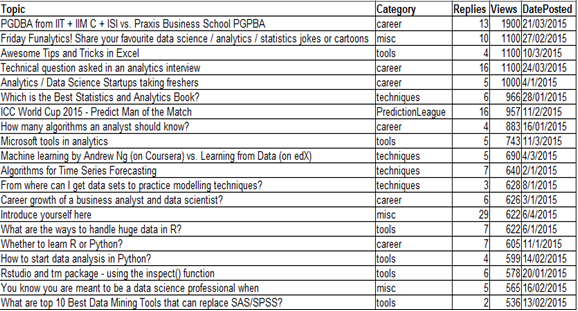 For purpose of the illustration, we will use a dataset ‘discuss’ taken from the Analytics Vidhya Discuss. The data contains the topic of discussion, category, number of replies to the post and the total number of Views. The data contains the top 20 topics: