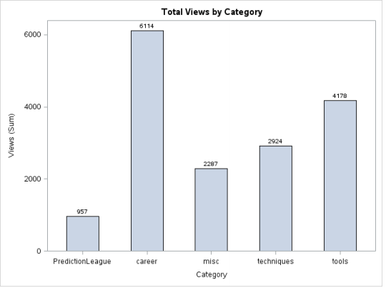 proc sgplot data = discuss; hbar category/response = views stat = sum datalabel datalabelattrs=(weight=bold); title 'Total Views by Category'; run;