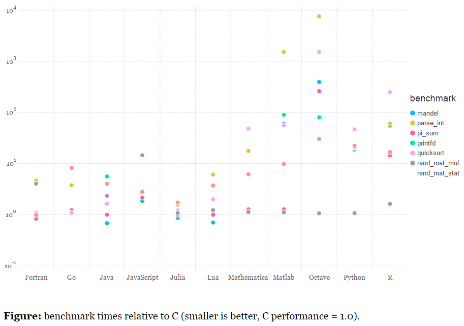 The simplest way to understand its power is to think of it as a language which has a wide range of statistical packages like R, it is easy to write and learn like Python and has execution speed similar to C / C++. If you are still not convinced about what I have mentioned, have a look at benchmarks of a few common benchmarks below: