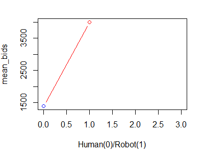 1. Density plot for mean response time : As you can see from below chart, Robots have some fixed time lag between their bids. However, humans take non-regular time between bids. This looks very intuitive as robots will be programmed to bid and hence show a common pattern.