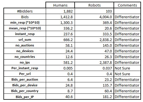 Finding variables which are able to distinguish humans from robots is the first thing you will do before building any kind of model. Here is a simple way to do this :