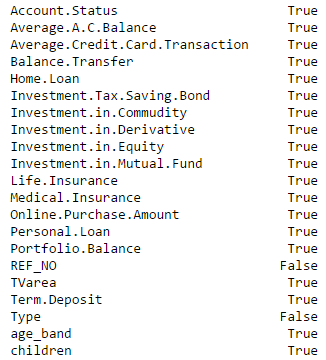 ID_col = ['REF_NO'] target_col = ["Account.Status"] cat_cols = ['children','age_band','status','occupation','occupation_partner','home_status','family_income','self_employed', 'self_employed_partner','year_last_moved','TVarea','post_code','post_area','gender','region'] num_cols= list(set(list(fullData.columns))-set(cat_cols)-set(ID_col)-set(target_col)-set(data_col)) other_col=['Type'] #Test and Train Data set identifier