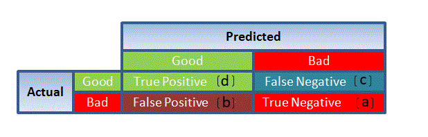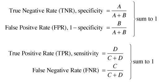 Very nice article but the figure of confusion matrix does not match with the specificity/sensitivity formulas. Should change to TNR = D/C+D ; TPR = A/A+B