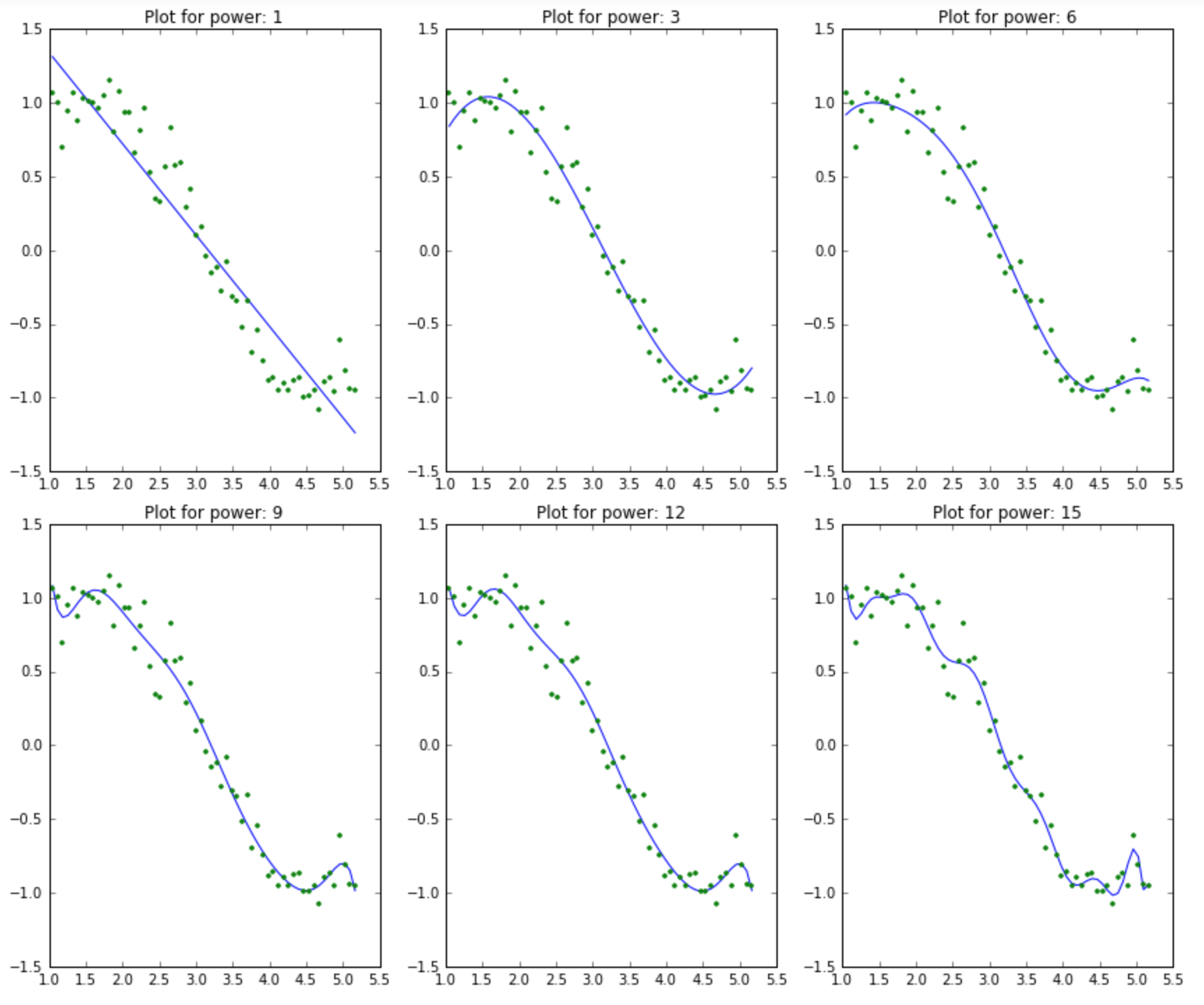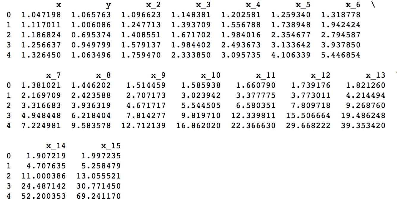 This resembles a sine curve but not exactly because of the noise. We’ll use this as an example to test different scenarios in this article. Let’s try to estimate the sine function using polynomial regression with powers of x from 1 to 15. Let’s add a column for each power upto 15 in our dataframe. This can be accomplished using the following code: