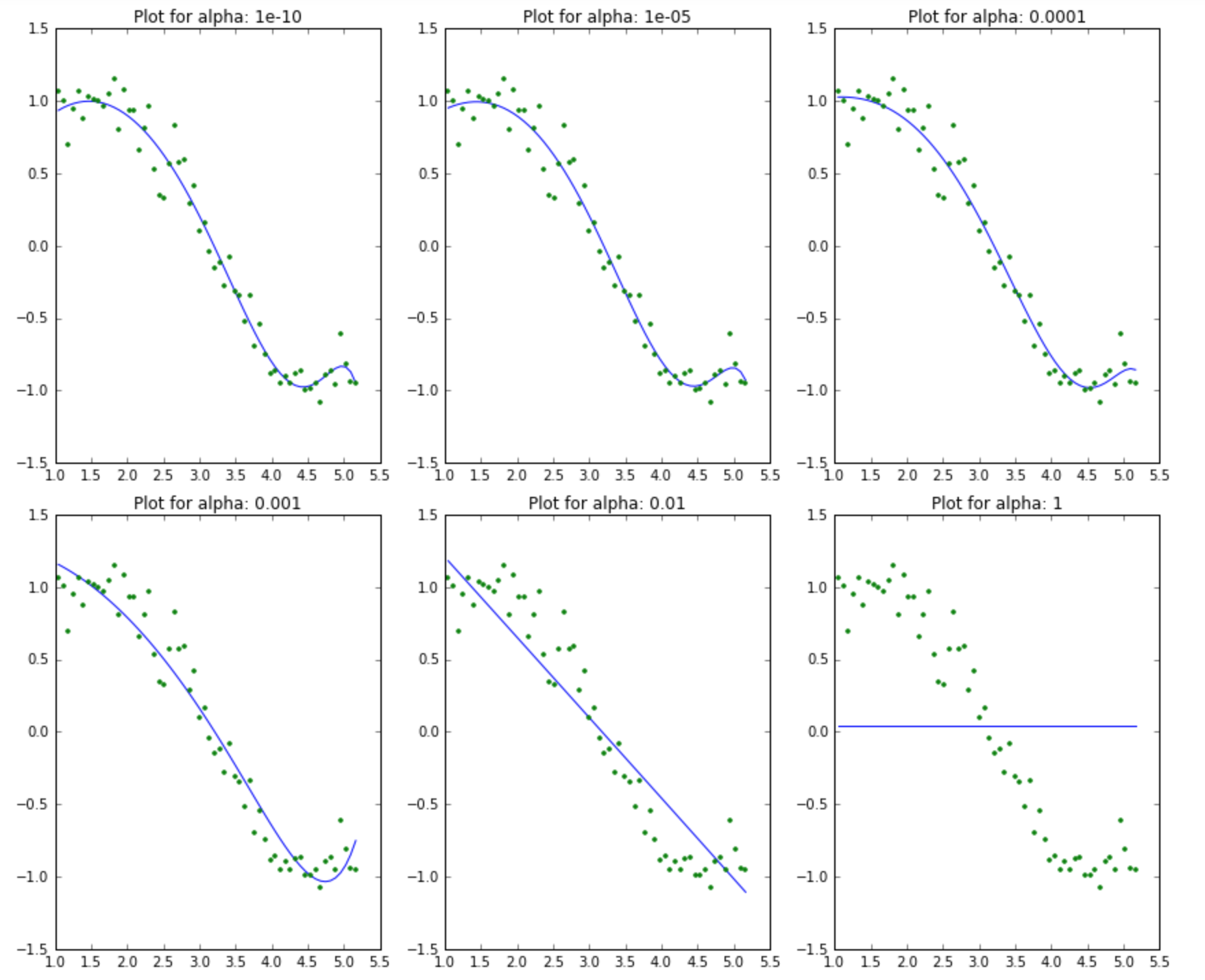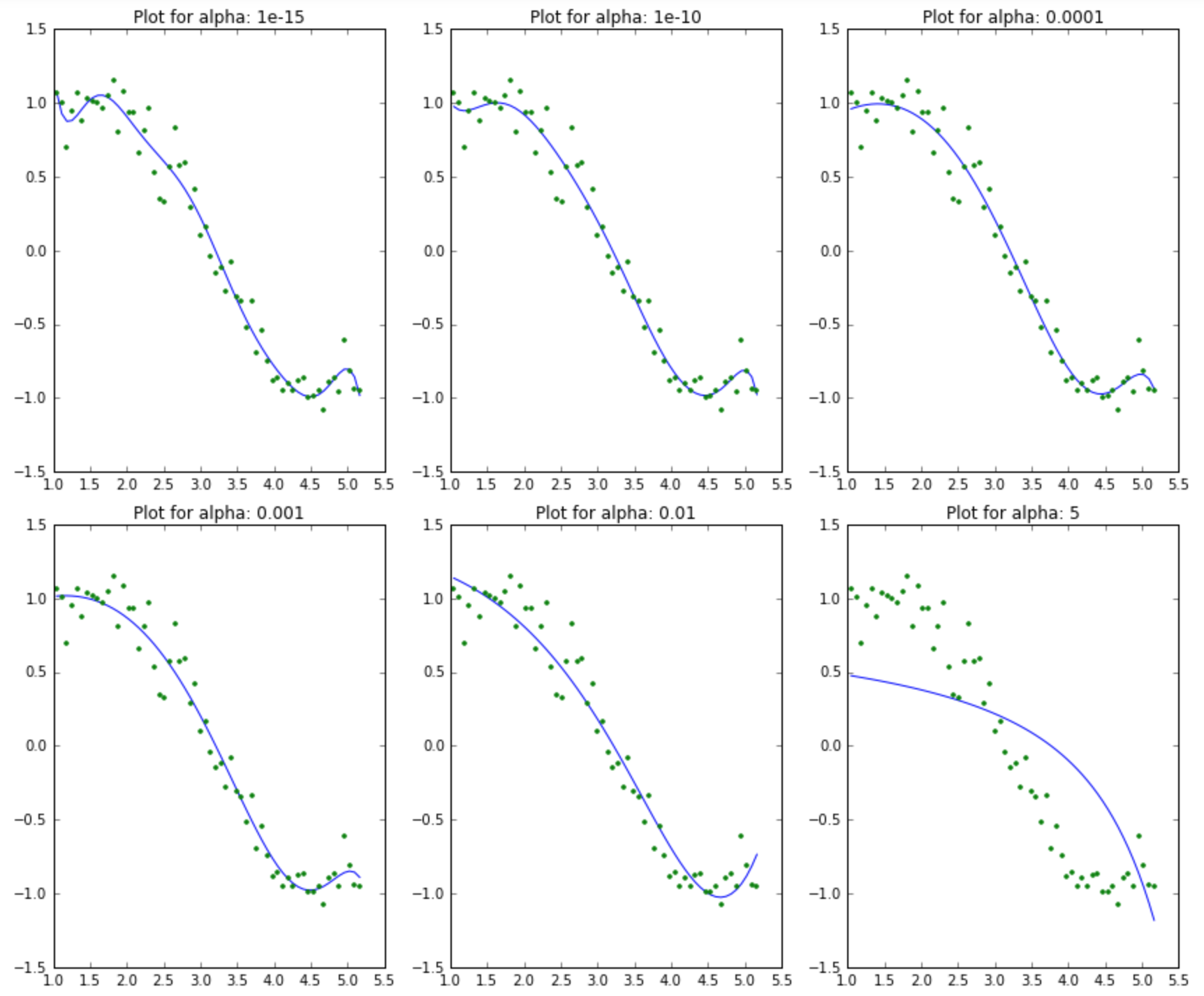 Here we can clearly observe that as the value of alpha increases, the model complexity reduces. Though higher values of alpha reduce overfitting, significantly high values can cause underfitting as well (e.g., alpha = 5). Thus alpha should be chosen wisely. A widely accepted technique is cross-validation, i.e., the value of alpha is iterated over a range of values, and the one giving a higher cross-validation score is chosen.