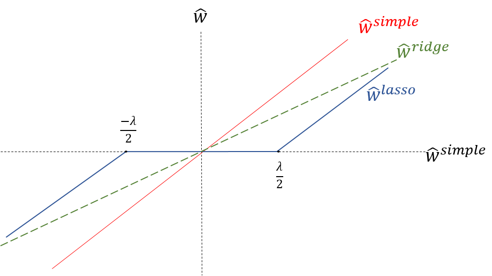 Let’s summarize our understanding by comparing the coefficients in all the three cases using the following visual, which shows how the ridge and lasso coefficients behave in comparison to the simple linear regression case.