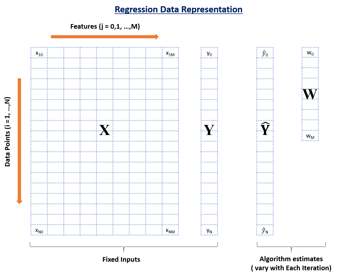 Here, N is the total number of data points available, and M is the total number of features. X has M+1 columns because of M features and 1 intercept.
