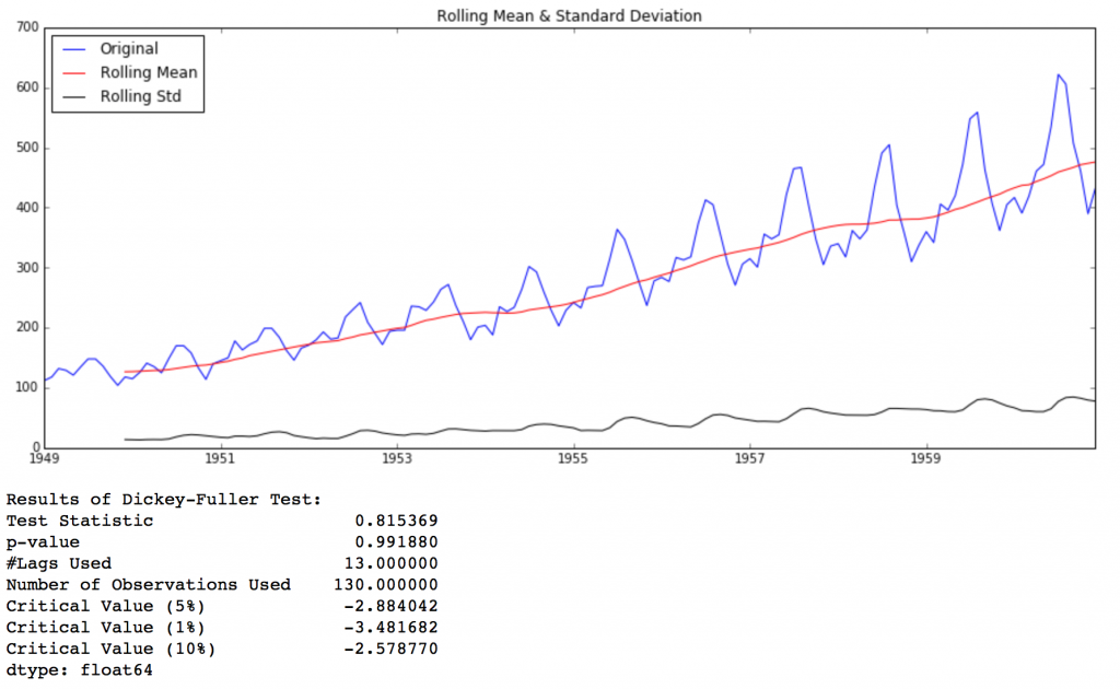 It is clearly evident that there is an overall increasing trend in the data along with some seasonal variations. However, it might not always be possible to make such visual inferences (we’ll see such cases later). So, more formally, we can check stationarity using the following: