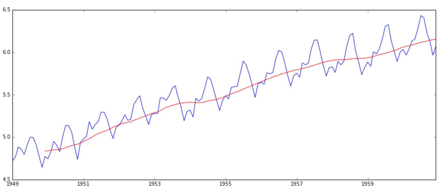 moving_avg = pd.rolling_mean(ts_log,12) plt.plot(ts_log) plt.plot(moving_avg, color='red')