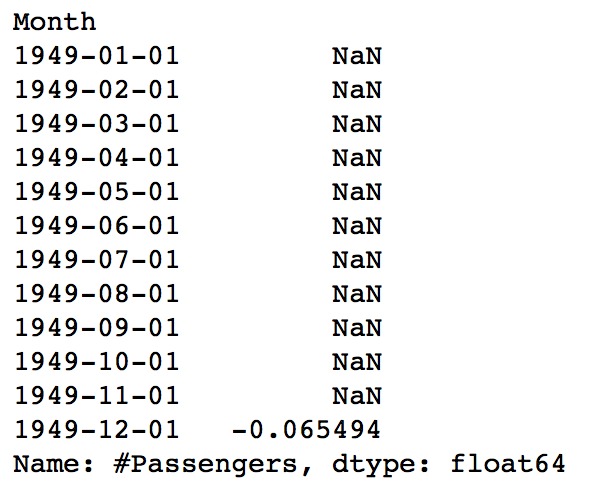 The red line shows the rolling mean. Lets subtract this from the original series. Note that since we are taking average of last 12 values, rolling mean is not defined for first 11 values. This can be observed as: