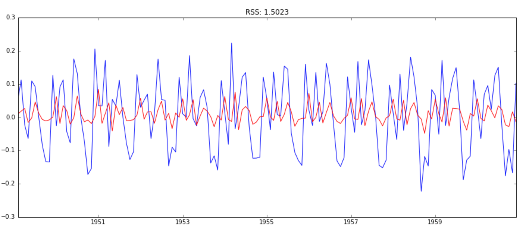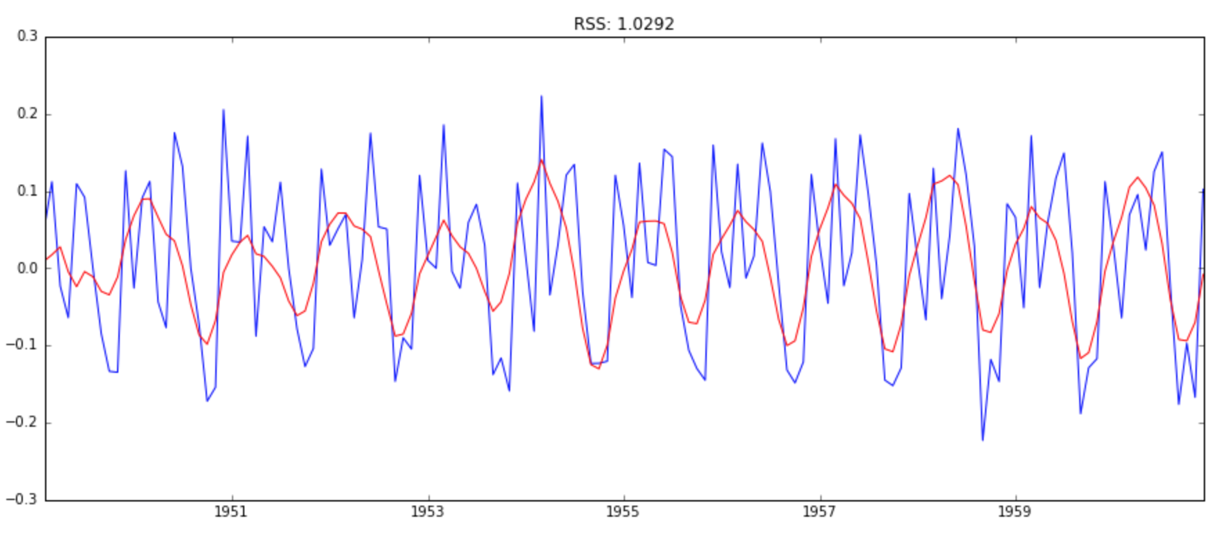 Now, lets make 3 different ARIMA models considering individual as well as combined effects. I will also print the RSS for each. Please note that here RSS is for the values of residuals and not actual series.