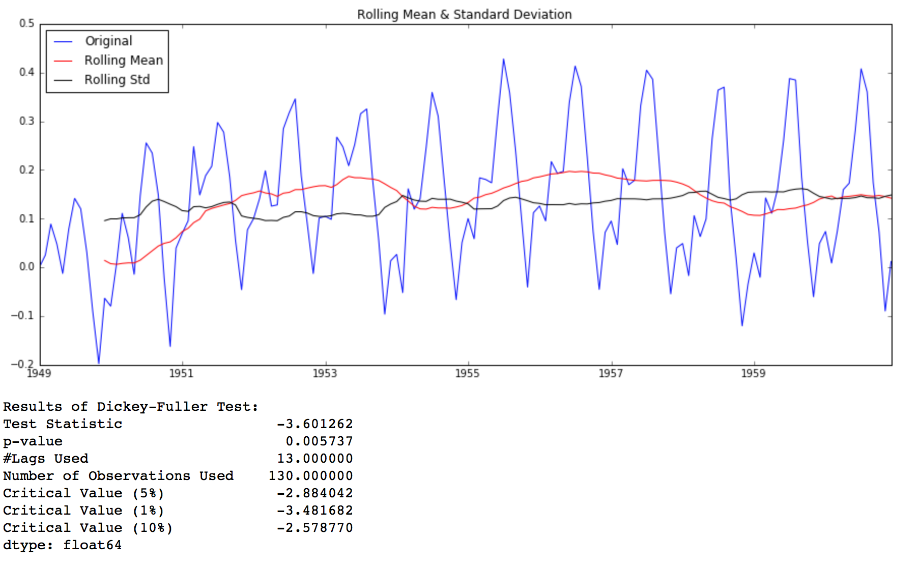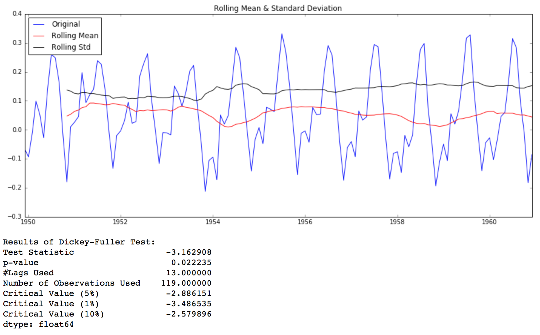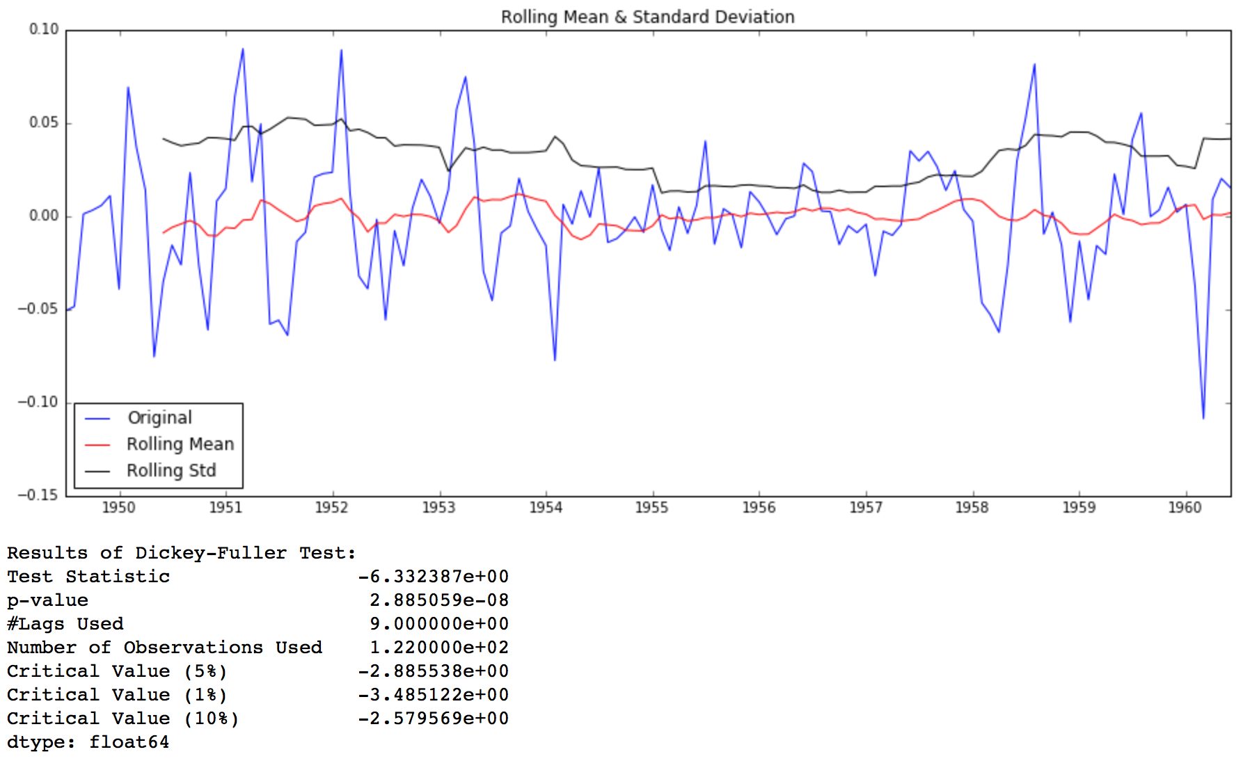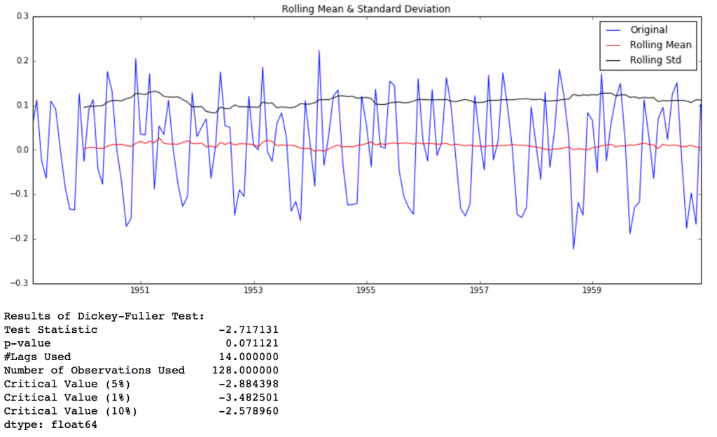 This looks like a much better series. The rolling values appear to be varying slightly but there is no specific trend. Also, the test statistic is smaller than the 5% critical values so we can say with 95% confidence that this is a stationary series.