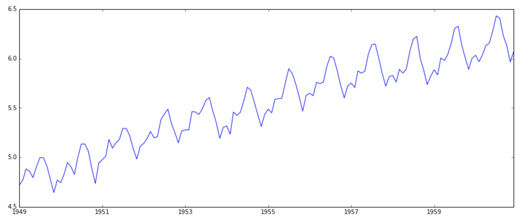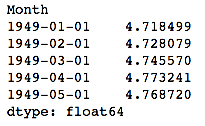 predictions_ARIMA_log = pd.Series(ts_log.ix[0], index=ts_log.index) predictions_ARIMA_log = predictions_ARIMA_log.add(predictions_ARIMA_diff_cumsum,fill_value=0) predictions_ARIMA_log.head()