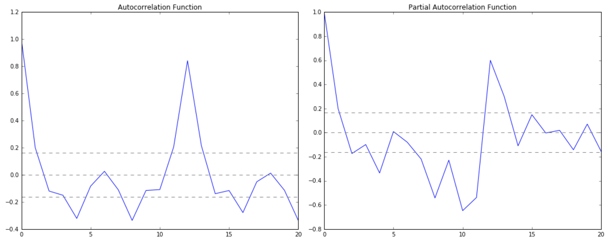 lag_acf = acf(ts_log_diff, nlags=20) lag_pacf = pacf(ts_log_diff, nlags=20, method='ols')