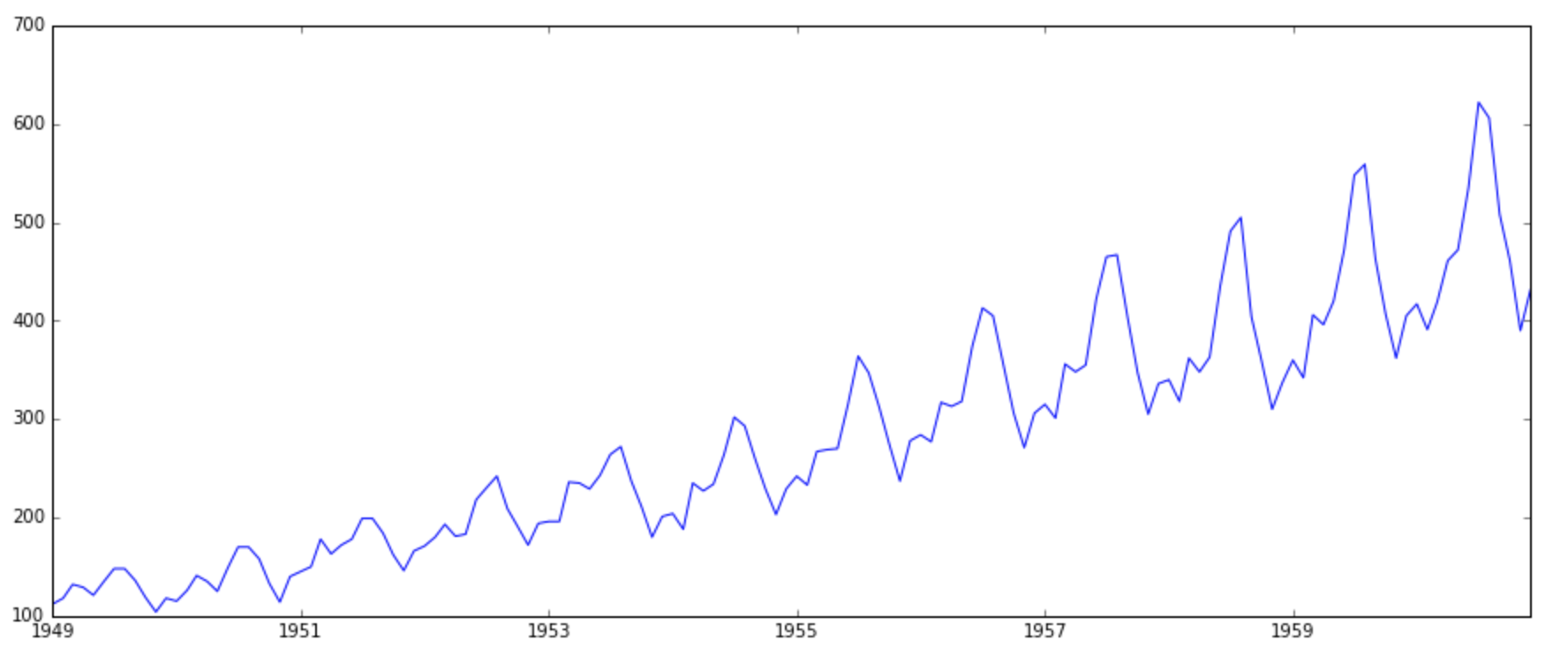 Because of the inherent properties of a TS, there are various steps involved in analyzing it. These are discussed in detail below. Lets start by loading a TS object in Python. We’ll be using the popular AirPassengers data set which can be downloaded here.