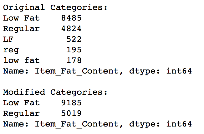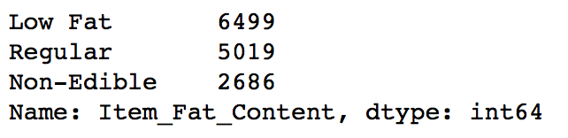 1. Item_Fat_Content: Some of ‘Low Fat’ values mis-coded as ‘low fat’ and ‘LF’. Also, some of ‘Regular’ are mentioned as ‘regular’.