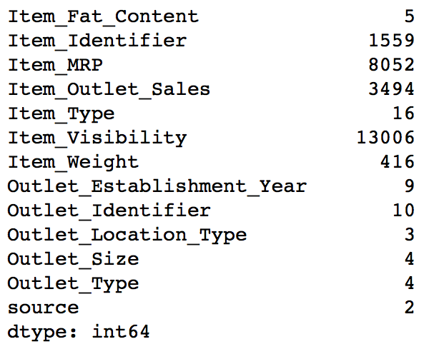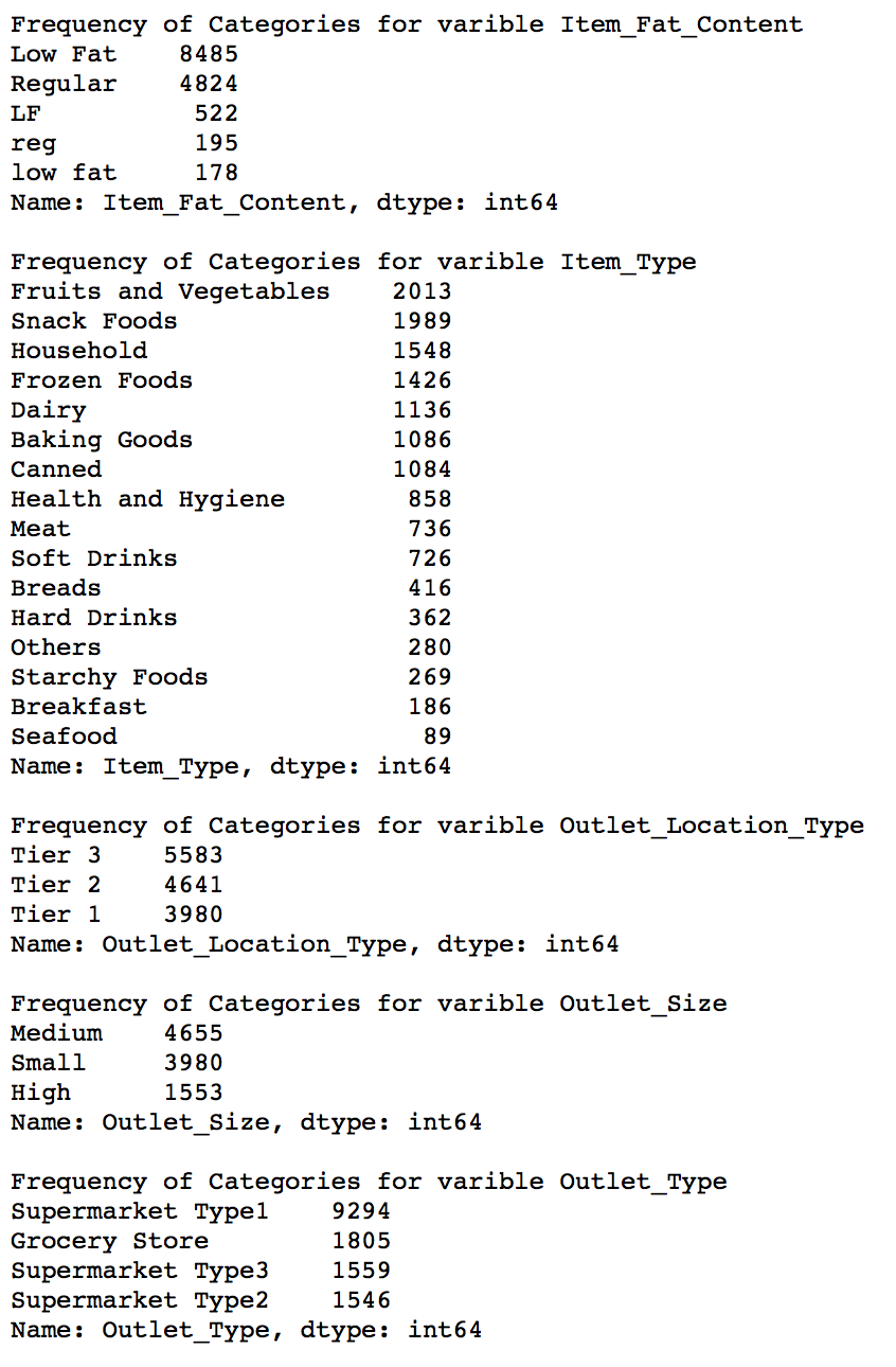 This tells us that there are 1559 products and 10 outlets/stores (which was also mentioned in problem statement). Another thing that should catch attention is that Item_Type has 16 unique values. Let’s explore further using the frequency of different categories in each nominal variable. I’ll exclude the ID and source variables for obvious reasons.