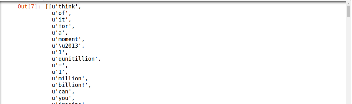 rdd2 = rdd.flatMap(Func) rdd2.take(5) Output: [u'think', u'of', u'it', u'for', u'a']