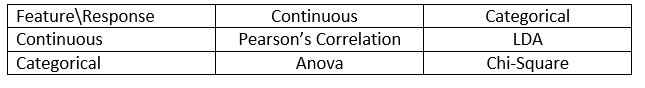 • Chi-Square: It is a is a statistical test applied to the groups of categorical features to evaluate the likelihood of correlation or association between them using their frequency distribution.