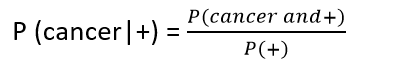 Let’s now try to calculate the probability of having cancer given that he tested positive on the first test i.e. P (cancer|+)