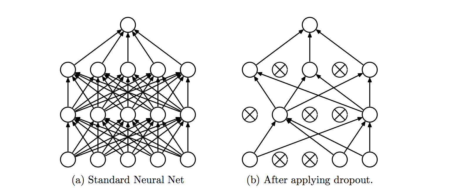 15) Dropout – Dropout is a regularization technique which prevents over-fitting of the network. As the name suggests, during training a certain number of neurons in the hidden layer is randomly dropped. This means that the training happens on several architectures of the neural network on different combinations of the neurons. You can think of drop out as an ensemble technique, where the output of multiple networks is then used to produce the final output.