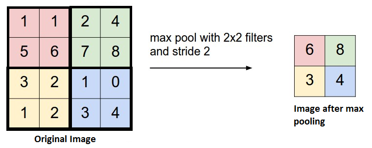 19) Pooling – It is common to periodically introduce pooling layers in between the convolution layers. This is basically done to reduce a number of parameters and prevent over-fitting. The most common type of pooling is a pooling layer of filter size(2,2) using the MAX operation. What it would do is, it would take the maximum of each 4*4 matrix of the original image.