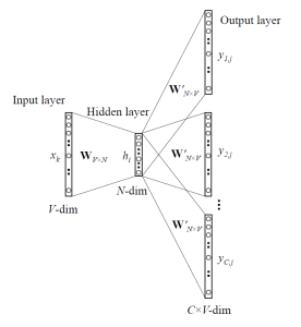 Input layer size – [1 X V], Input hidden weight matrix size – [V X N], Number of neurons in hidden layer – N, Hidden-Output weight matrix size – [N X V], Output layer size – C [1 X V]