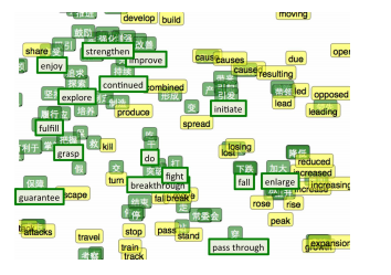 The above graph is a bilingual embedding with chinese in green and english in yellow. If we know the words having similar meanings in chinese and english, the above bilingual embedding can be used to translate one language into the other.