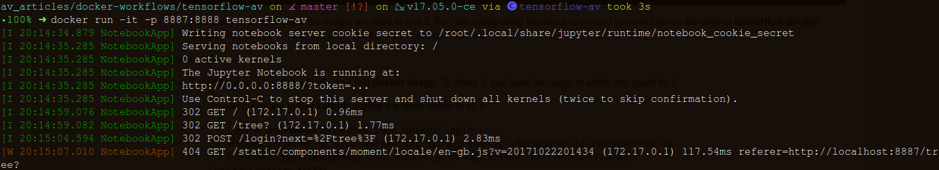 Wasn’t that easy? Now as a exercise, replace -it in the docker run command by -d. See whether you can get the tensorflow jupyter environment again or not?