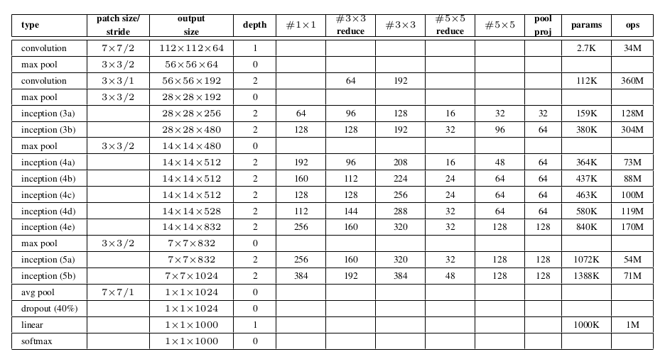 The paper proposes a new type of architecture – GoogLeNet or Inception v1. It is basically a convolutional neural network (CNN) which is 27 layers deep. Below is the model summary: