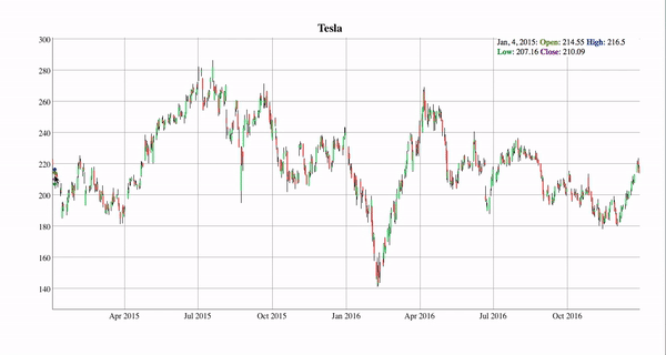 Here, we take the example of Tesla’s stocks. The candlestick charts can be used to maneuver across each date and see the lows and highs of stocks individually. This could help us take better investment decisions based on current or past market trends.