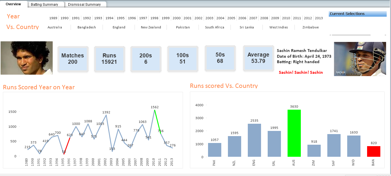 Look at the visualization below. It showcases details about Sachin Tendulkar’s test match career. You can talk about various metrics here using the graphs and numbers. This also shows why business understanding is so important – you can’t talk about metrics you have no experience with!